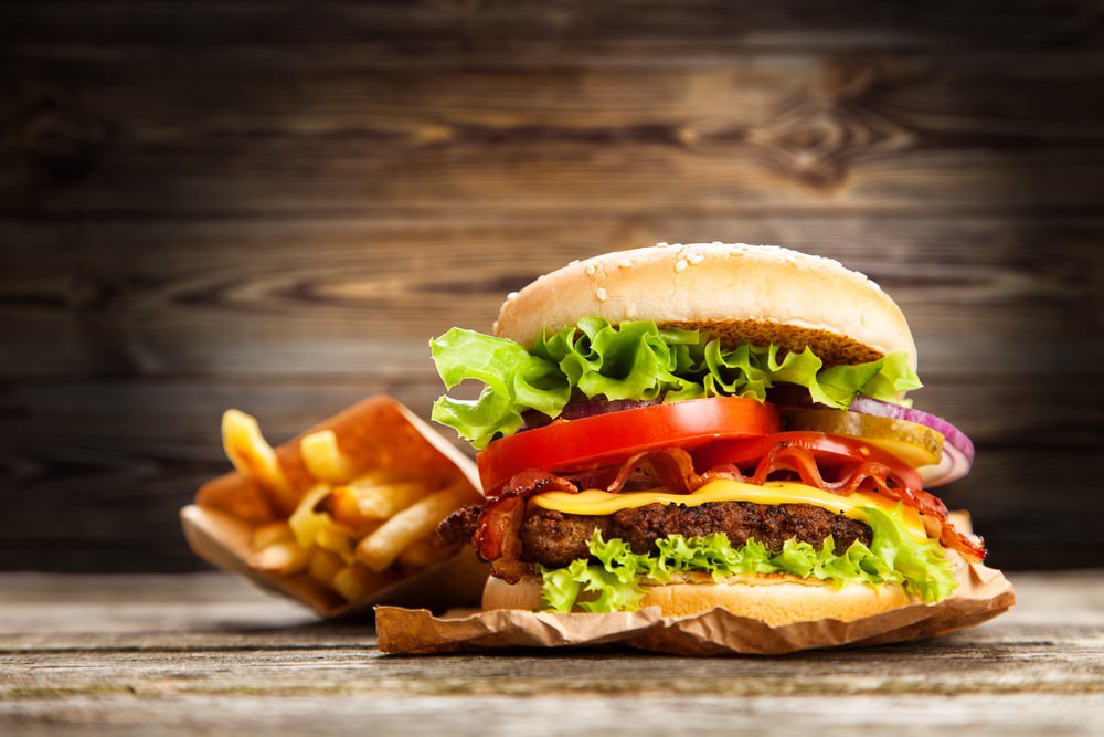 broodje hamburger speciaal met portie patat, rauwkost en saus naar keuze